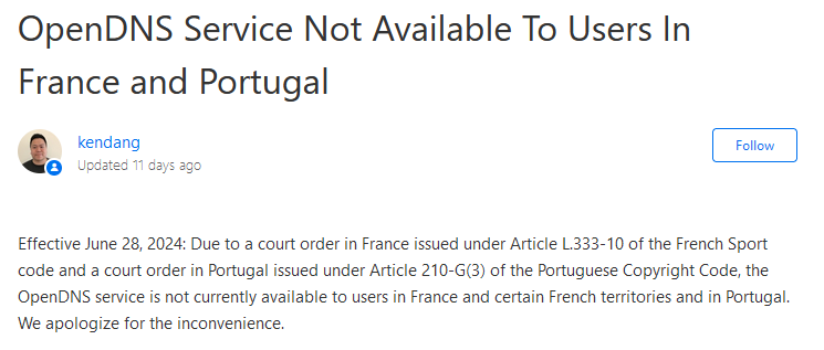 En raison d'une décision de justice, OpenDNS, propriété de Cisco, a cessé ses services en France depuis le 28 juin 2024. Cette décision est le résultat d'une demande de Canal+ visant à bloquer des sites de streaming sportif illégaux, notamment ceux diffusant la Formule 1.